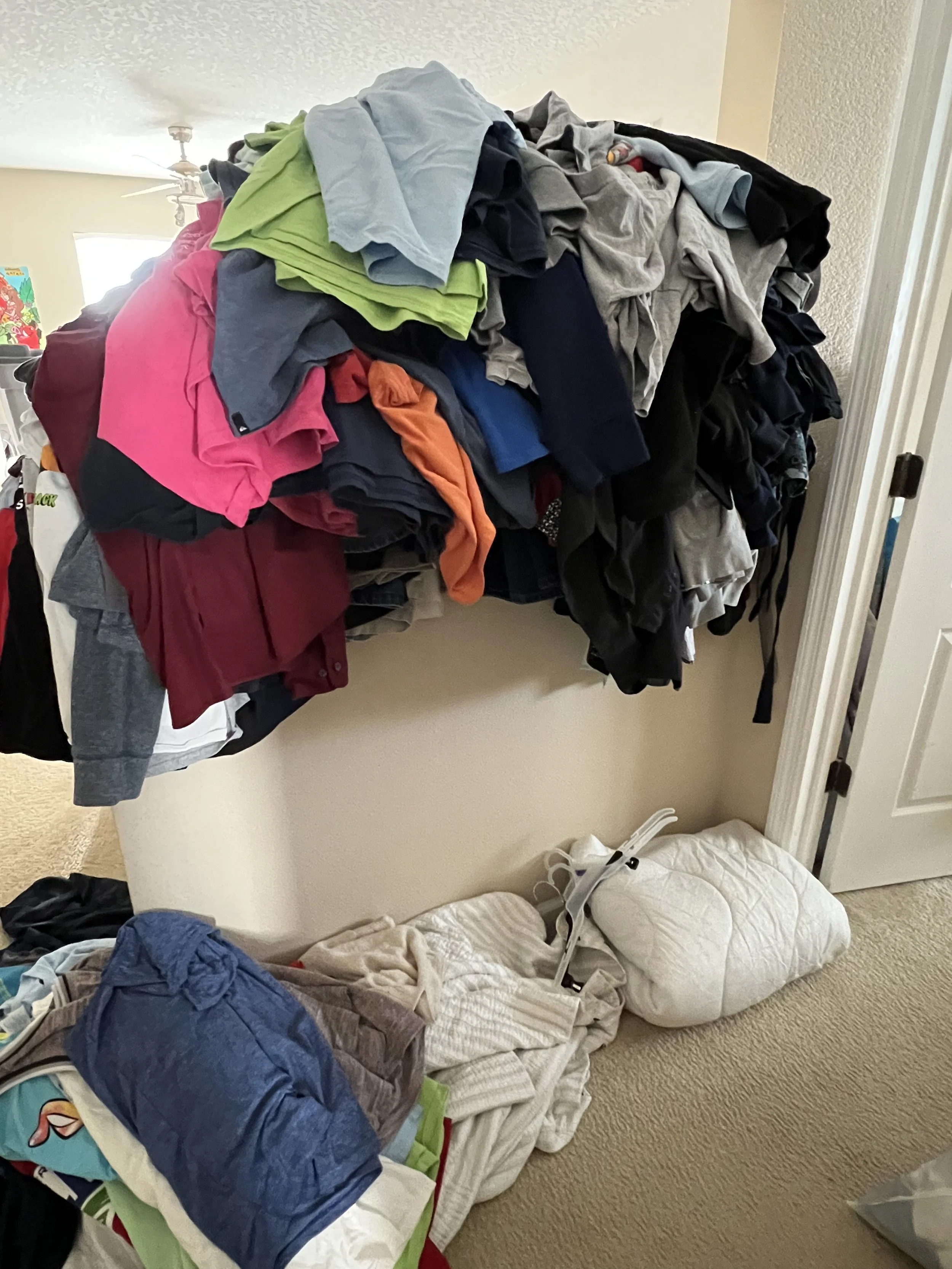 We cleared this closet one category at a time. The first image shows clothes packed tightly on hangers; the second shows the sorting process as items were reviewed and set aside for donation. By the end, we filled nine bags to bless others and created a wardrobe the client can confidently use and maintain.