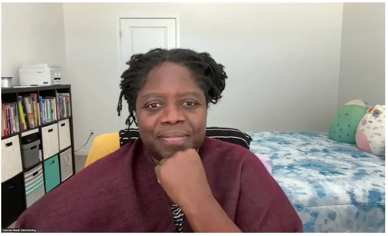 Wendy Zanders smiling during a virtual decluttering session in her home office